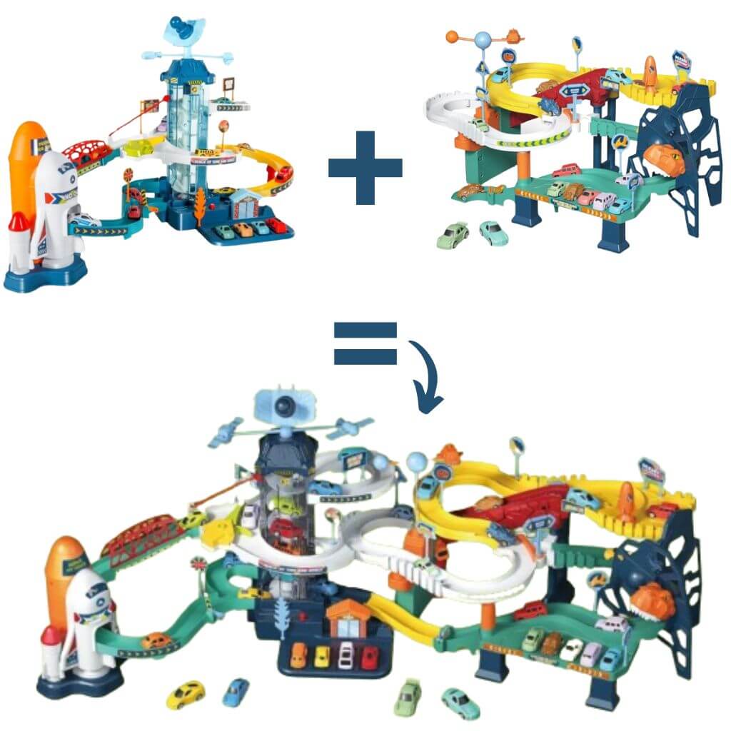 - Dois mundos, uma aventura: Escolha entre a emoção pré-histórica da pista de Dinossauro ou a velocidade intergaláctica da pista de Foguete . Cada conjunto vem com um carrinho exclusivo para combinar com o tema!